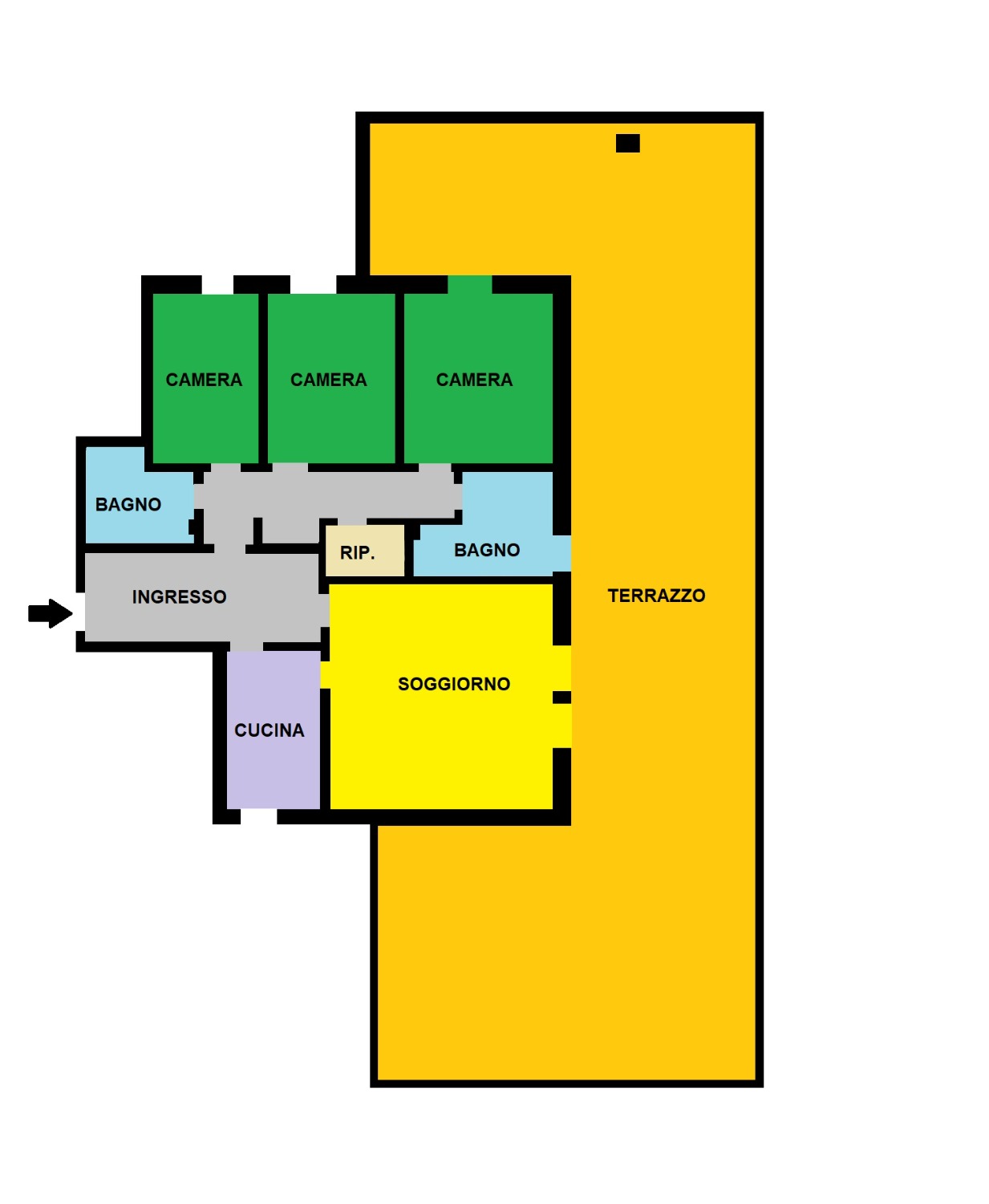 L’appartamento è composto da ingresso, ampio soggiorno con camino e con accesso alla grande terrazza panoramica, cucina abitabile, disimpegno notte, 3 ampie camere, doppi servizi, ripostiglio.